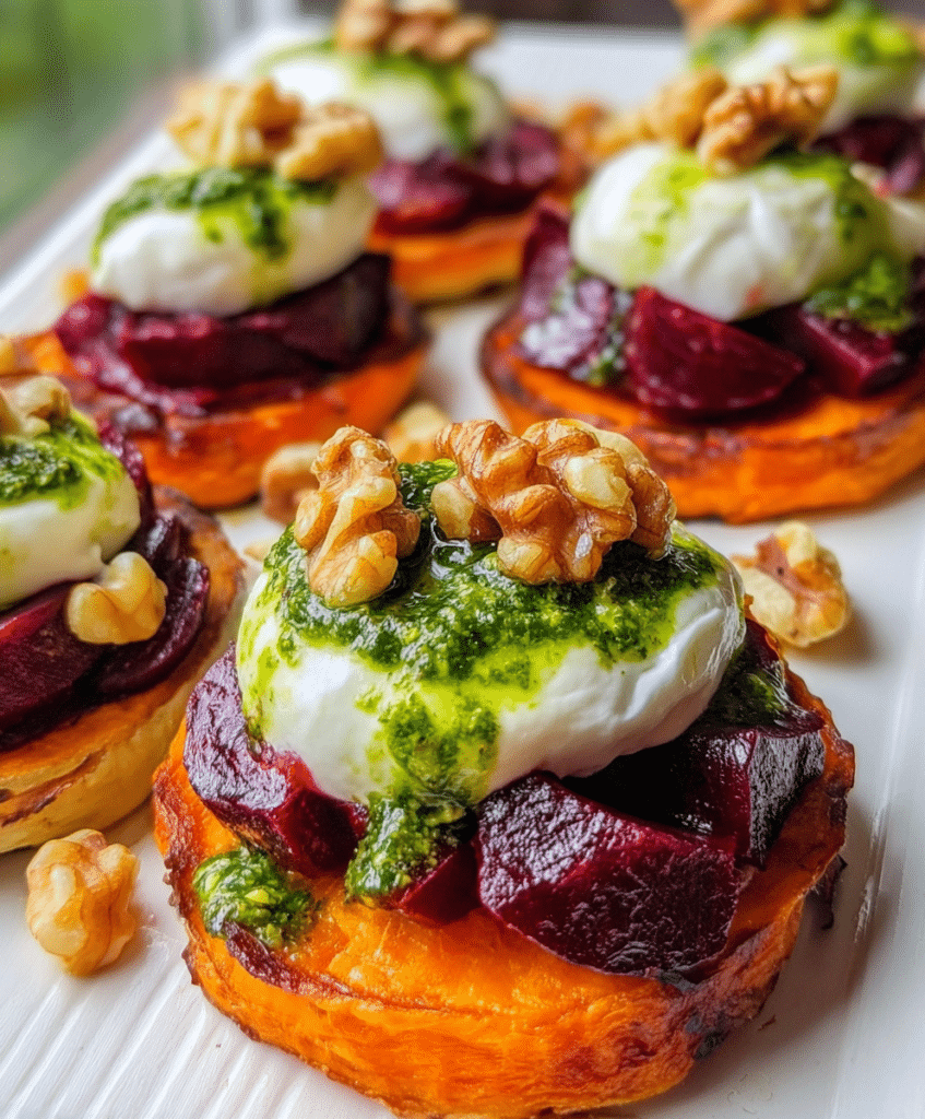 Easy Roasted Sweet Potato Rounds with Beets, Burrata & Pesto – Flavorful Vegetarian Appetizer