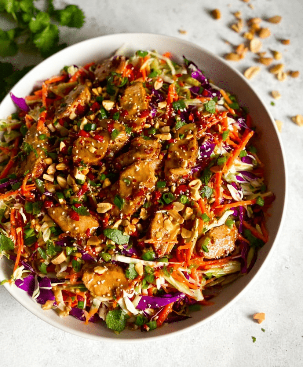 Toss the prepared salad with the peanut dressing to your liking. Add the cooked chicken and gently mix to combine. Garnish with extra cilantro, sesame seeds, and chopped peanuts for added crunch. Serve immediately.