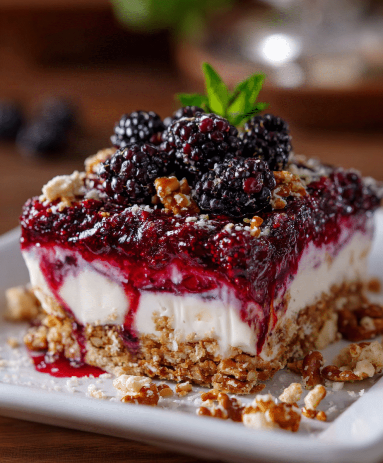 This version stays true to the original recipe you provided, using a baked pretzel crust, a fluffy cream cheese and Cool Whip layer, and a stovetop blackberry topping made from fresh berries. There are no shortcuts here, just simple ingredients coming together in layers that taste far more luxurious than the effort required. Best of all, it’s a make-ahead dessert that needs time to chill, which makes it ideal for entertaining or planning ahead.