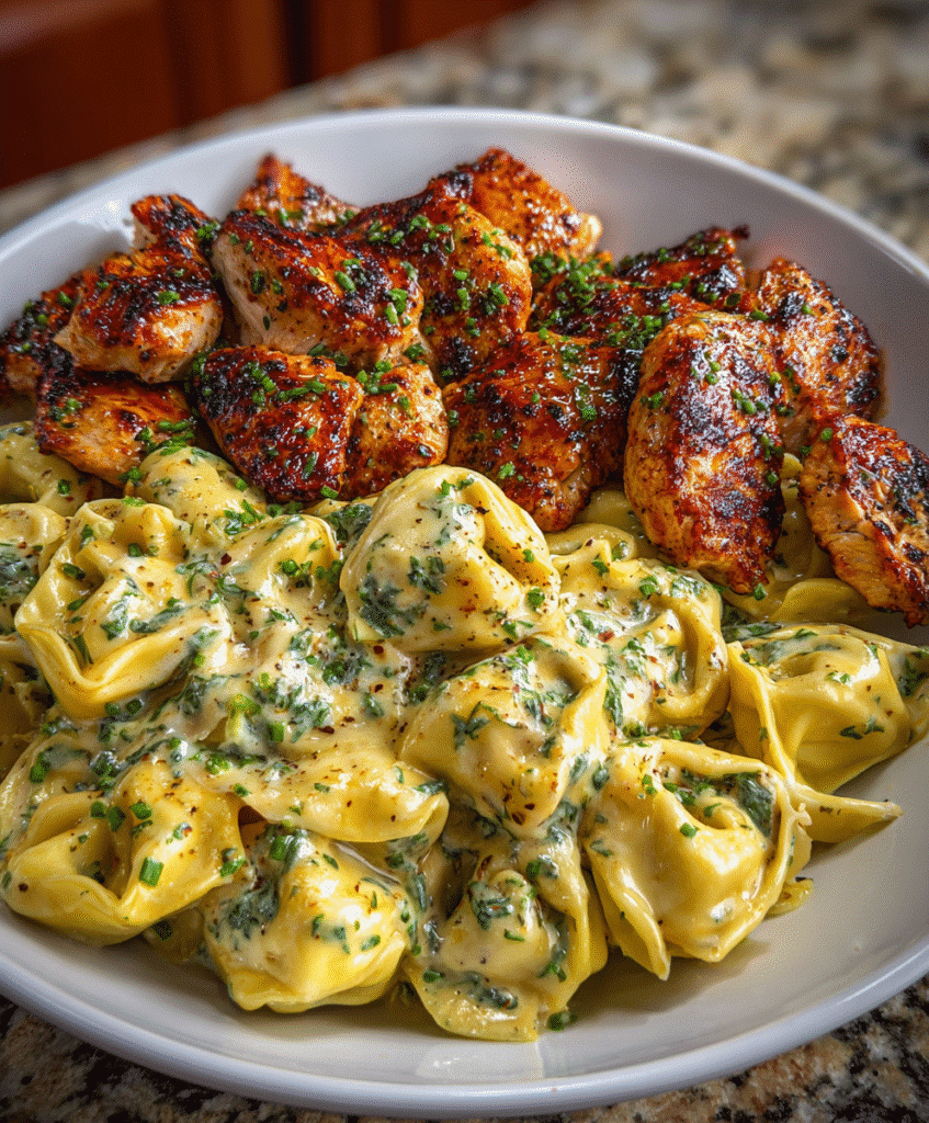 If there’s one dish that perfectly embodies creamy indulgence, rich flavor, and simple elegance, it’s this Creamy Garlic Parmesan Chicken Tortellini in Mozzarella Three-Cheese Sauce. Tender chicken strips, pillowy cheese …