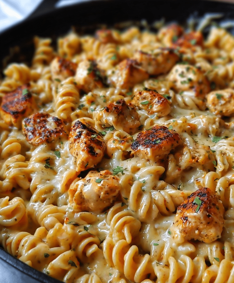 A creamy, comforting skillet dish with tender chicken, a rich cheese sauce, and Cajun seasoning, served with rotini pasta. Perfect for a quick weeknight meal that’s flavorful and satisfying.