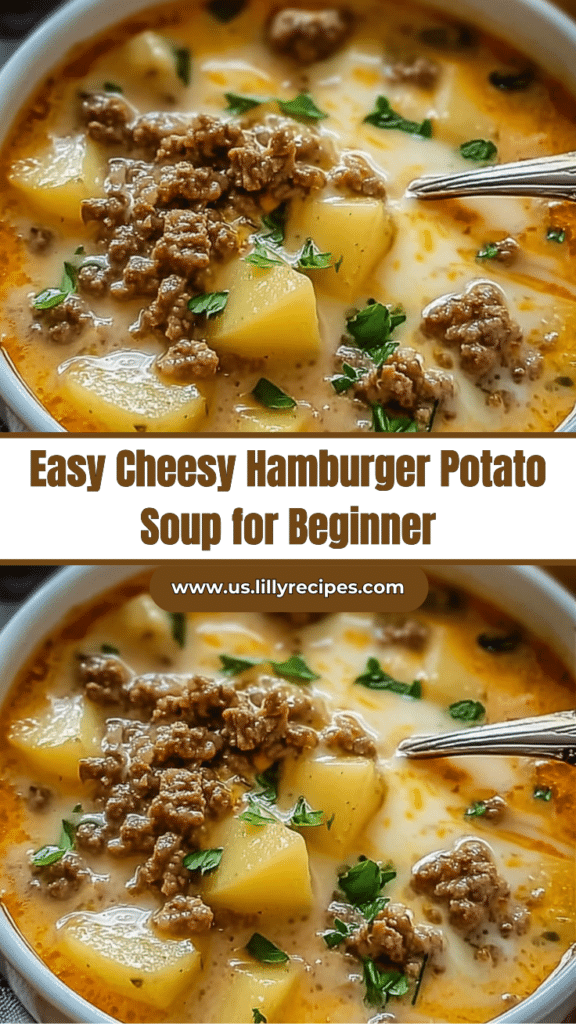 Cheesy Hamburger Potato Soup is a warm, hearty, and creamy comfort food perfect for beginner cooks and family dinners alike. With simple ingredients, minimal prep, and a velvety, cheesy broth, this soup satisfies both taste buds and appetite. Garnish with fresh parsley and serve hot with bread or rolls for a meal that’s guaranteed to become a favorite. Save this recipe and enjoy a quick, comforting dinner any night of the week.