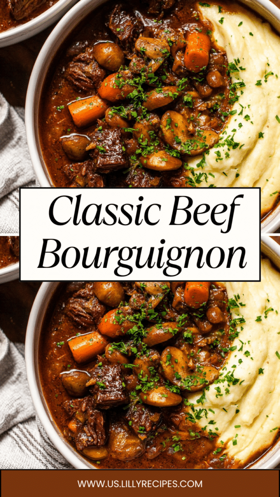 Classic Beef Bourguignon is a rich French stew featuring tender beef simmered in red wine with aromatic vegetables, mushrooms, and pearl onions. Perfect for holidays or cozy dinners.
