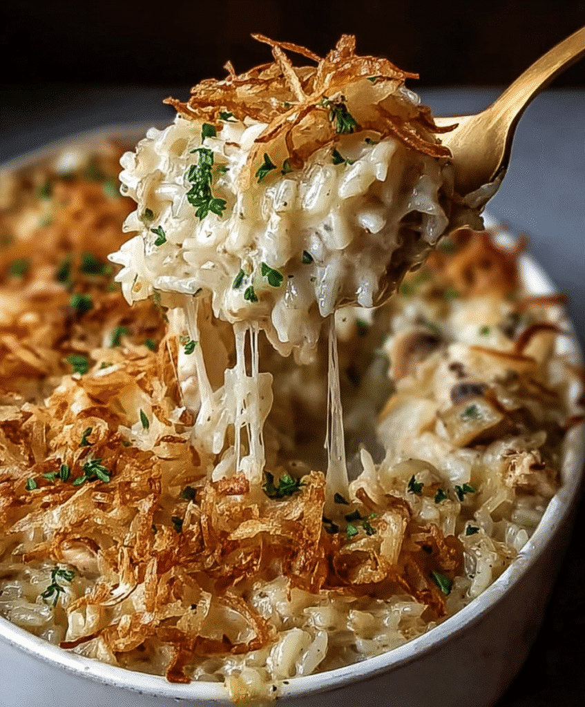 There are few things more satisfying than a warm, cozy casserole that brings everyone to the table with happy sighs and empty plates. This French Onion Chicken Rice Bake is exactly that kind of meal—simple to assemble, deeply comforting, and bursting with the rich, savory flavors you’d expect from a classic French onion dish. With tender chicken, creamy rice, melted cheese, and a golden blanket of crispy fried onions, it’s the type of homestyle dinner that becomes part of your weekly rotation before you even realize it.
