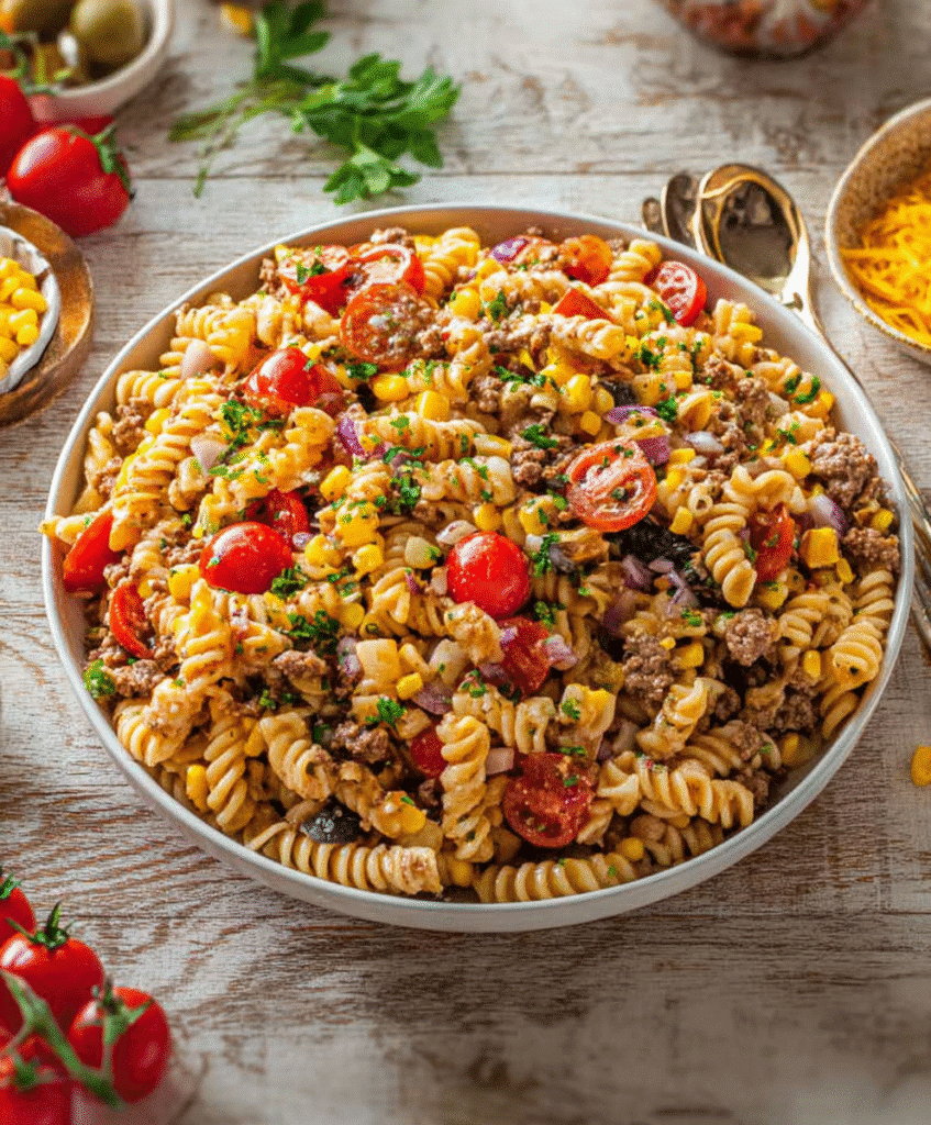 Few dishes capture the carefree spirit of summer cookouts and backyard gatherings like Cowboy Pasta Salad. This hearty twist on the classic pasta salad combines Tex-Mex flair with down-home comfort — a true crowd-pleaser that doubles as both a side and a main dish. With seasoned ground beef, smoky bacon, sweet corn, black beans, juicy tomatoes, and sharp cheddar, all tossed in a creamy BBQ-mayo dressing, it’s the kind of dish that brings smiles, seconds, and recipe requests every time.