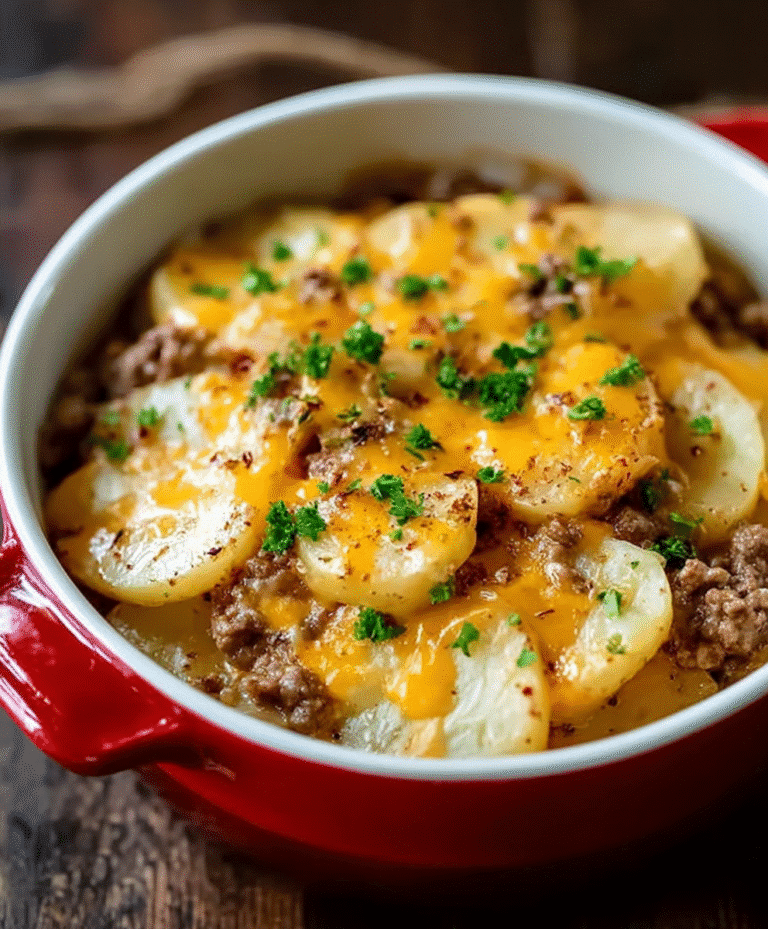 A hearty slow cooker casserole featuring layers of tender potatoes, seasoned ground beef, and melted cheddar cheese. Perfect comfort food for busy days with minimal effort.
