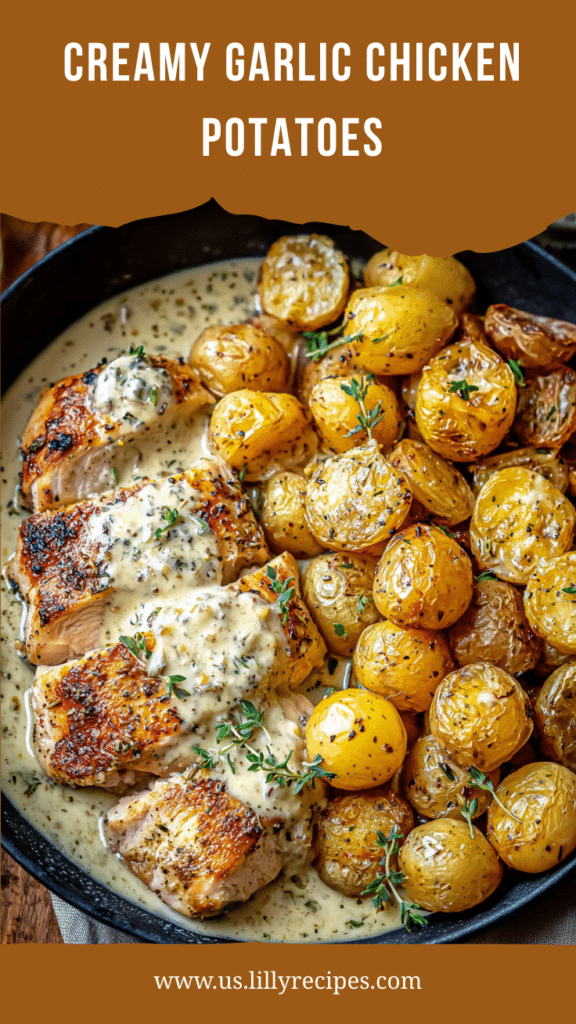 Creamy Garlic Chicken Potatoes features tender seared chicken breasts in a rich, garlicky cream sauce, paired with crispy roasted baby potatoes. This gluten-free dish is perfect for a flavorful weeknight or special occasion dinner.