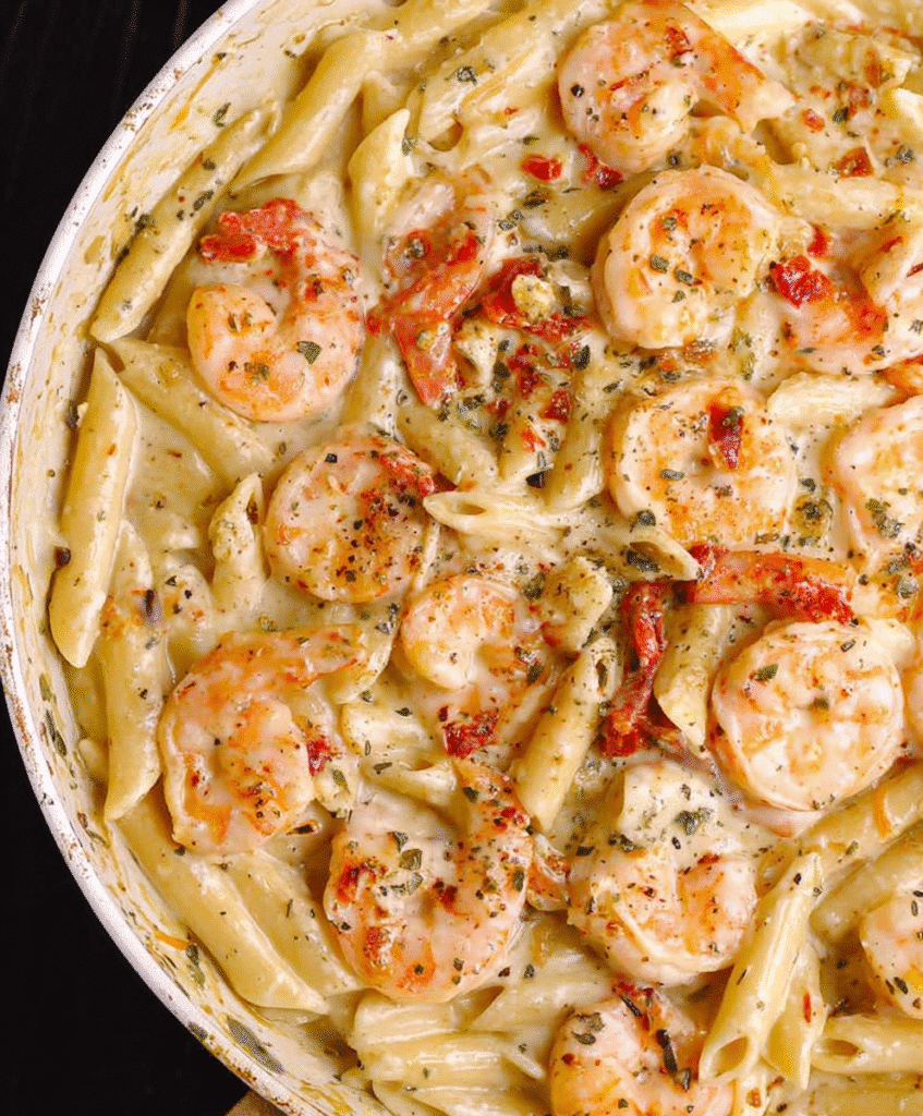 - Add cooked pasta and shrimp back to the skillet. Toss to coat evenly in the sauce. Simmer 2–3 minutes for flavors to meld.