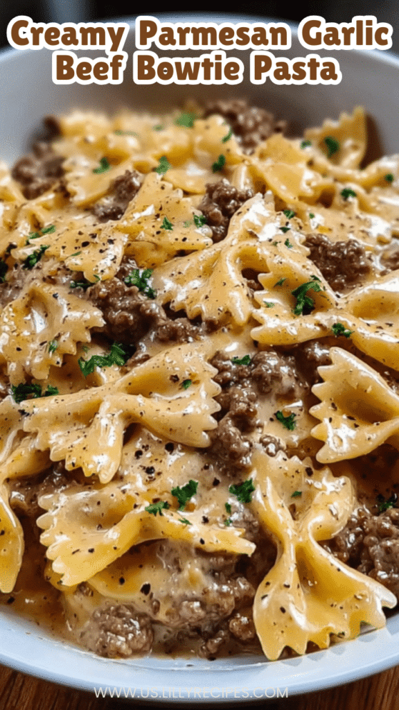 Creamy Parmesan Garlic Beef Bowtie Pasta is a comforting, flavorful, and easy one-pot meal perfect for weeknights or busy schedules. With rich, cheesy sauce, perfectly cooked bowtie pasta, and seasoned ground beef, it’s a hearty dinner that satisfies both kids and adults. Save this recipe, share with friends, and enjoy a warm, creamy, indulgent Italian-American meal in just 30 minutes.