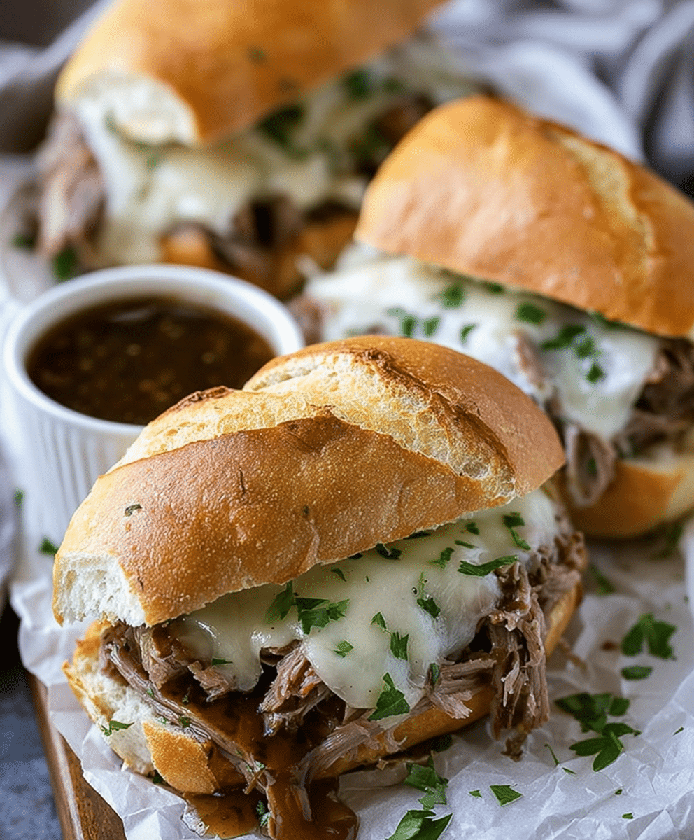 Serve these sandwiches hot, with a generous side of au jus for dipping. For presentation, sprinkle fresh parsley over the beef or plate sandwiches alongside small dipping bowls for a classic restaurant-style look.