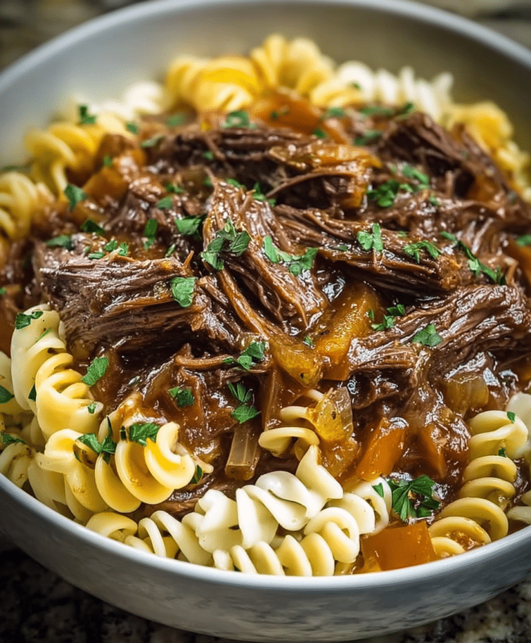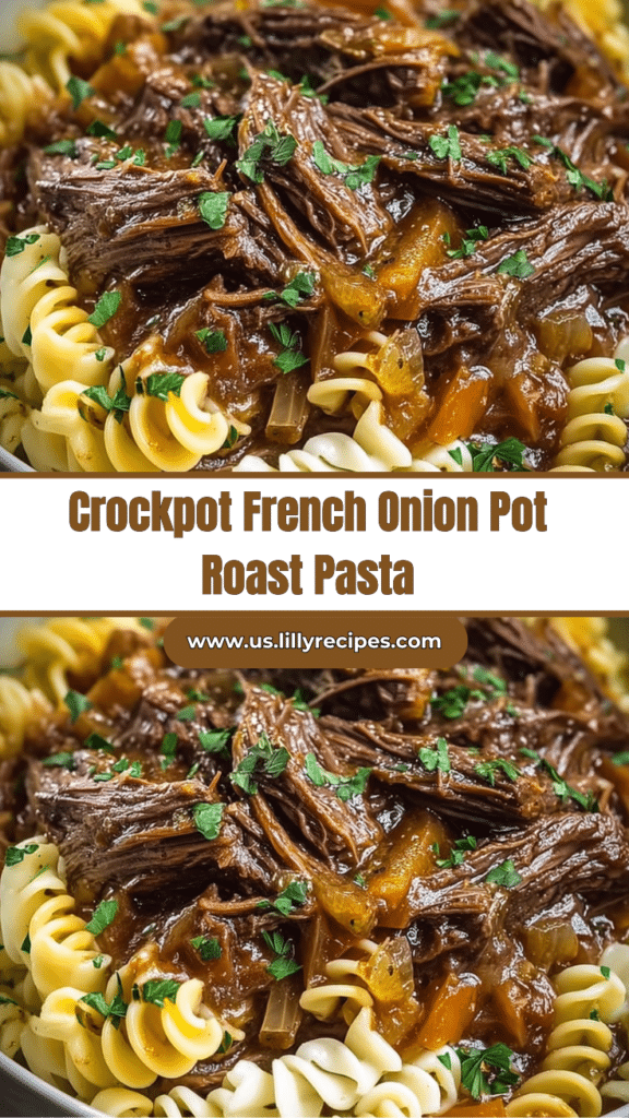 Crockpot French Onion Pot Roast Pasta is a hearty, slow-cooked meal that combines tender, flavorful beef with buttery egg noodles and rich French onion-inspired gravy. This easy Crockpot French Onion Pot Roast Pasta recipe transforms a classic pot roast into a comforting pasta dinner perfect for family meals, cozy weeknights, or make-ahead dinners. Slow-cooking the beef chuck roast with caramelized onions, garlic, and aromatics infuses the meat with deep flavor, while a mix of beef broth, white wine, Worcestershire sauce, and herbs creates a luscious gravy. Tossed with wide egg noodles and optionally topped with Gruyère cheese and fresh parsley, each bite is a rich, savory, melt-in-your-mouth experience. If you love slow-cooked comfort food or French onion-inspired recipes, this Crockpot French Onion Pot Roast Pasta is a guaranteed crowd-pleaser.