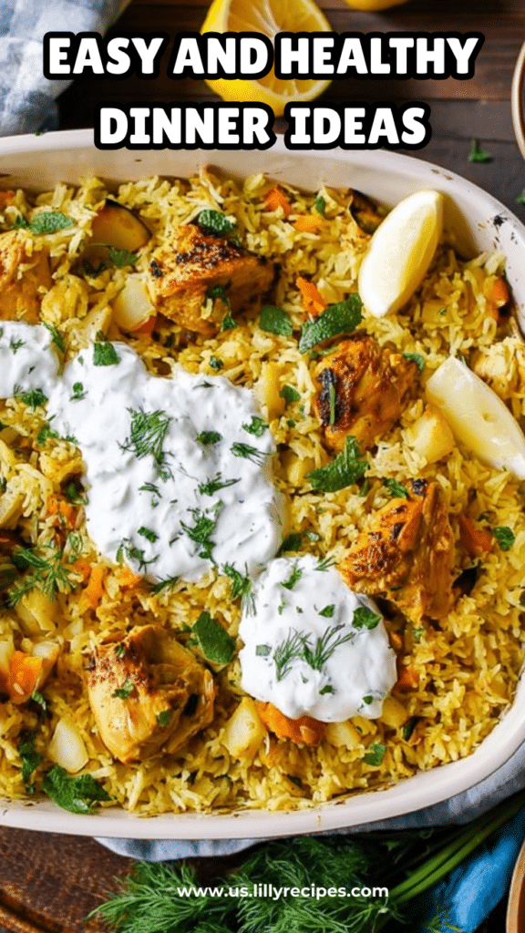 What truly sets this recipe apart is its simplicity. Everything comes together in a single baking dish—no stovetop cooking, no complicated techniques, and no pile of dirty pans. You simply season the chicken, add the remaining ingredients, cover, and bake. When it comes out of the oven, you’re greeted with fragrant rice, juicy chicken, and a dish that’s ready to be topped with cool tzatziki sauce, fresh herbs, and a squeeze of lemon.