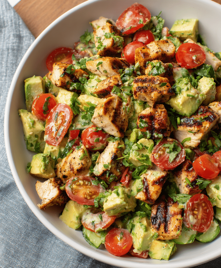 Avocado Chicken Salad is a refreshing take on the classic chicken salad, with creamy avocado replacing heavy mayonnaise and a medley of fresh vegetables adding crunch and vibrancy. The smoky flavor of cooked chicken pairs beautifully with the mild creaminess of avocado, while cherry tomatoes and cucumber provide juicy texture and color. Fresh cilantro adds a fragrant finish, and the lime-cumin dressing brings a zesty, aromatic touch that enhances all the flavors.