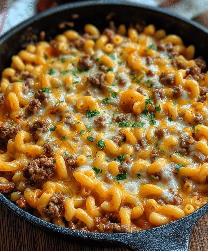 This dish blends tender macaroni, savory ground beef, warm spices, and a creamy melted cheddar sauce to create a skillet meal that feels familiar in the best way. Think of it as a homemade upgrade to boxed cheeseburger pasta mixes — but fresher, richer, and filled with real ingredients you can feel good about serving your family.