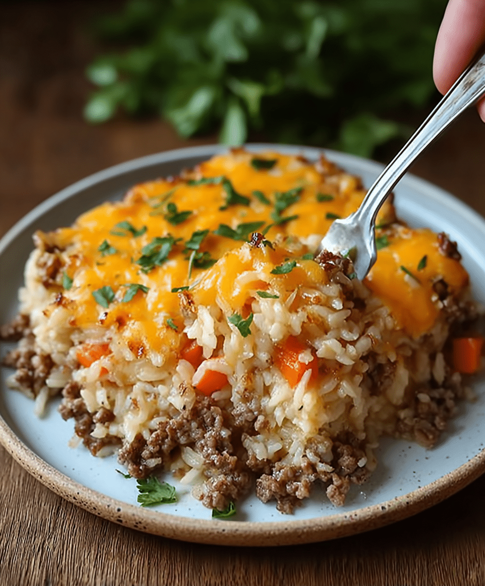 This cheesy hamburger rice casserole is rich, savory, and deeply comforting. The beef provides a hearty base, while the rice becomes soft and flavorful as it absorbs the broth and creamy soup.
