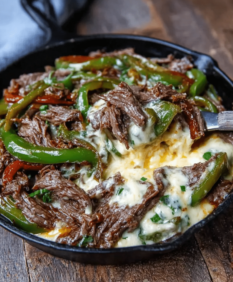 This recipe takes everything people love about the traditional sandwich—tender beef, sautéed peppers and onions, and melty cheese—and transforms it into a warm, creamy skillet meal that doesn’t require bread. Instead of being stuffed into a roll, the ingredients are cooked together in a savory cheese sauce that coats the steak and vegetables beautifully.