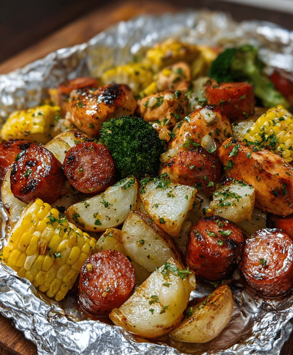 The chicken remains juicy as it cooks in the sealed packet, while the smoked sausage releases savory flavor into the surrounding vegetables. Potatoes become tender and absorb the garlic butter sauce, creating a soft, satisfying bite.