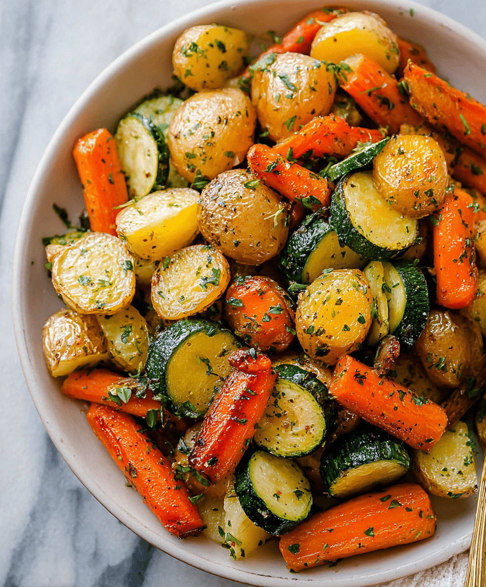 What makes this dish stand out is balance. The potatoes become tender inside with lightly crisp edges. The carrots turn slightly sweet and caramelized. The zucchini softens while absorbing the garlic and herbs. Rosemary and thyme add warmth and depth without overpowering the vegetables themselves.