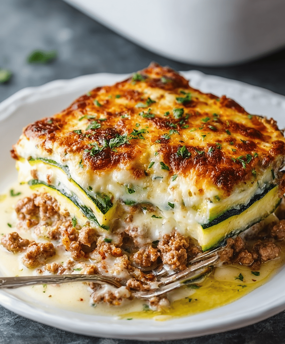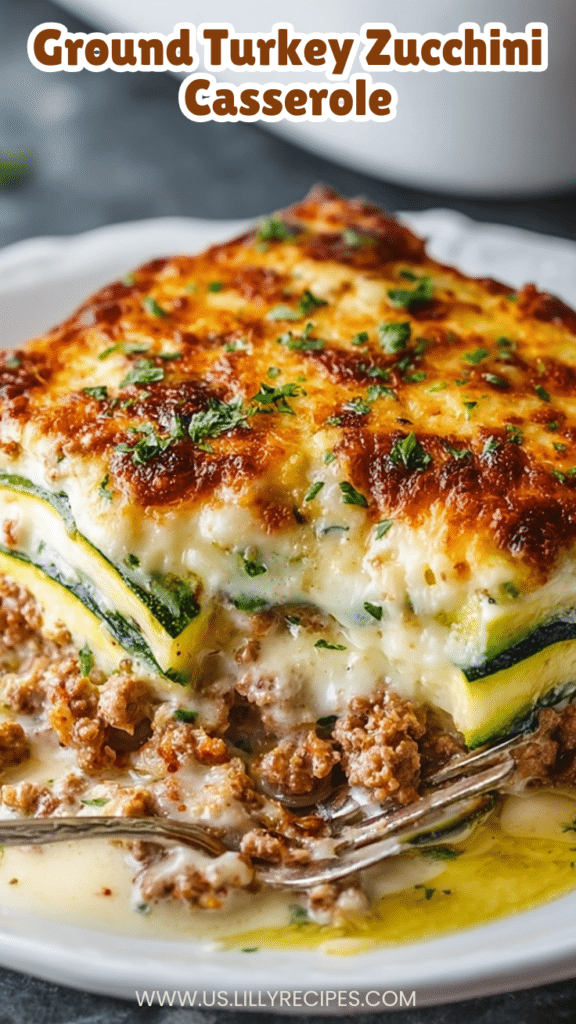 A healthy and comforting Ground Turkey Zucchini Casserole featuring layers of lean ground turkey, fresh zucchini slices, diced tomatoes, and melted mozzarella cheese, seasoned with Italian herbs and baked to bubbly perfection.