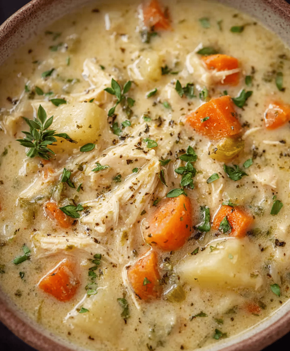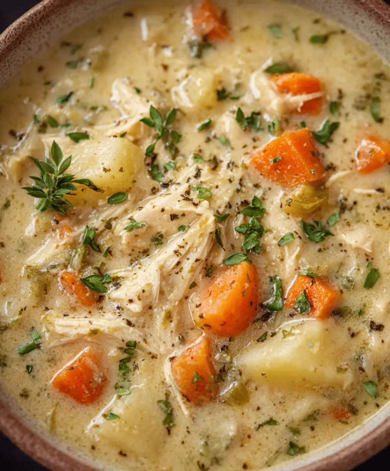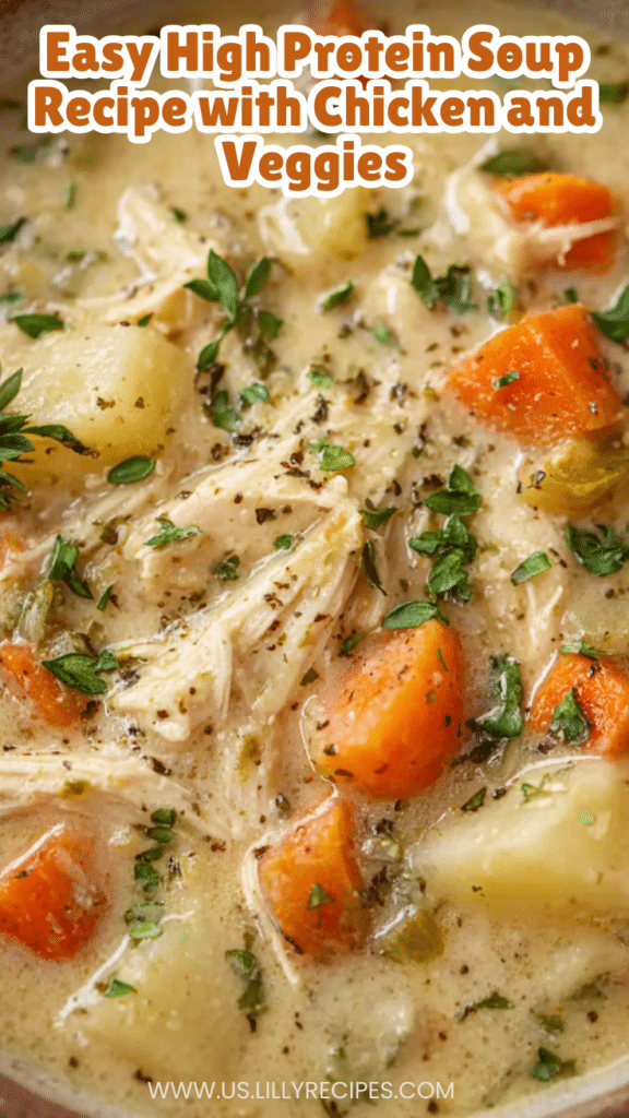 A creamy and hearty chicken pot pie soup packed with protein, vegetables, and comforting flavors, perfect for a cozy meal.