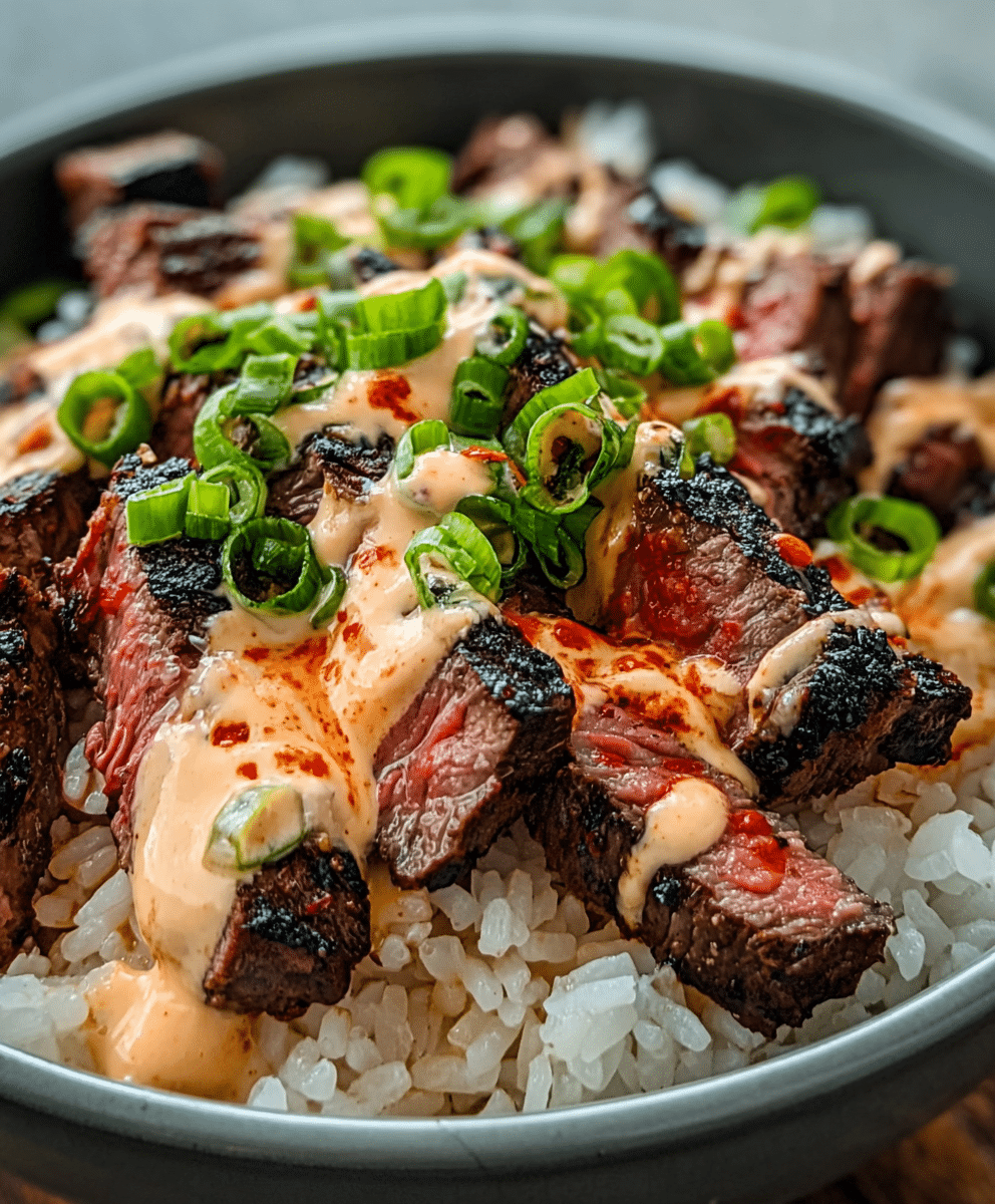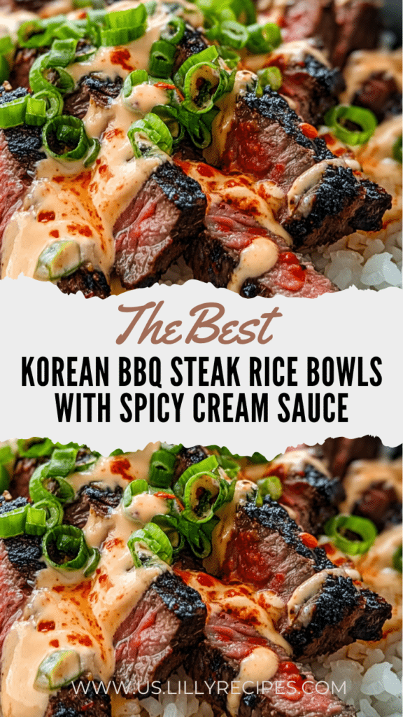 Korean BBQ Steak Rice Bowls with Spicy Cream Sauce feature tender marinated steak cubes served over fluffy rice and drizzled with a rich, spicy cream sauce for a bold and satisfying fusion meal.