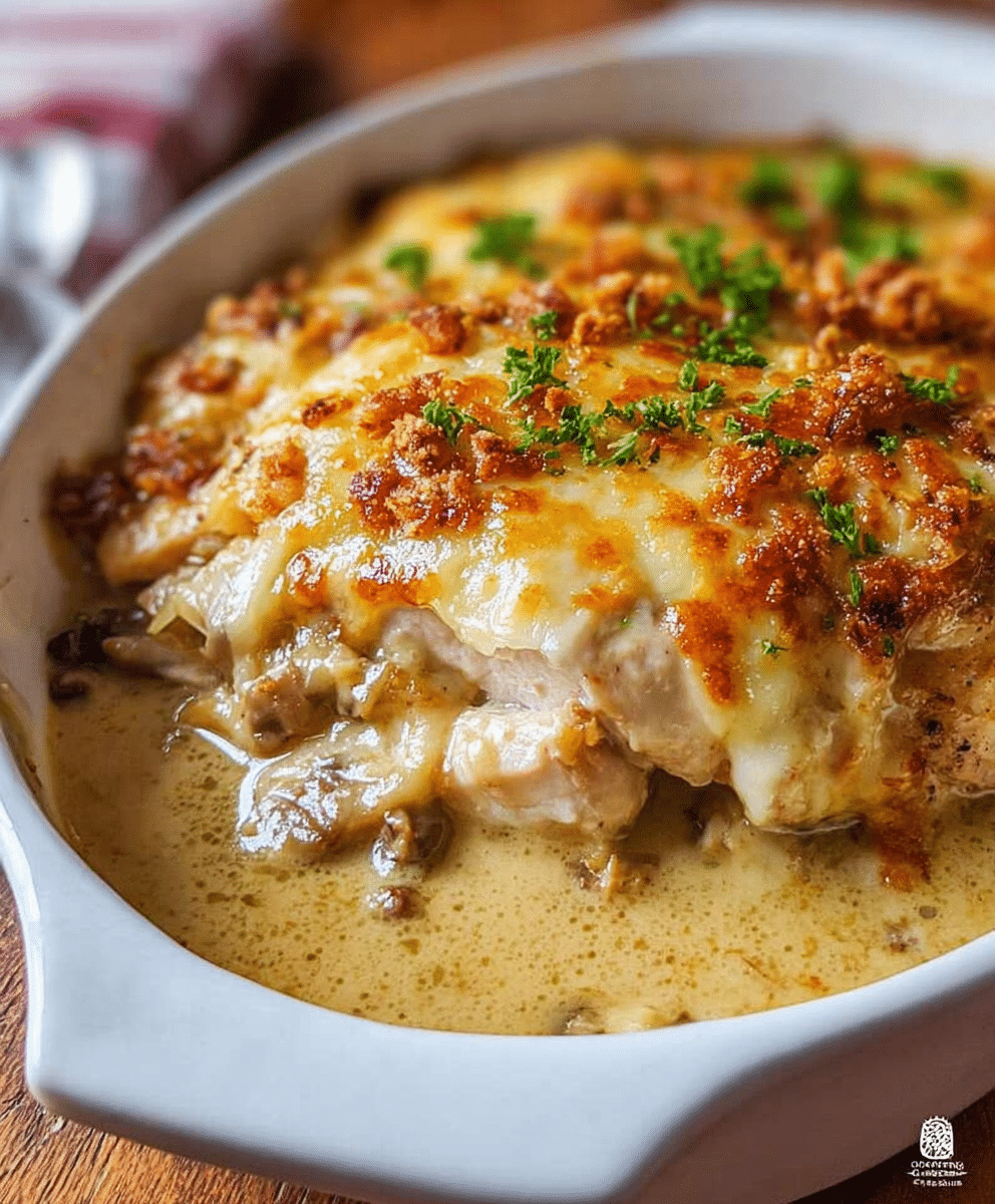 This dish stands out because it balances simplicity with indulgence. Tender chicken breasts are seasoned and topped with Swiss cheese, then blanketed in a creamy garlic-infused sauce. A generous layer of seasoned stuffing and melted butter transforms the top into a golden, slightly crisp crust that contrasts beautifully with the creamy base.