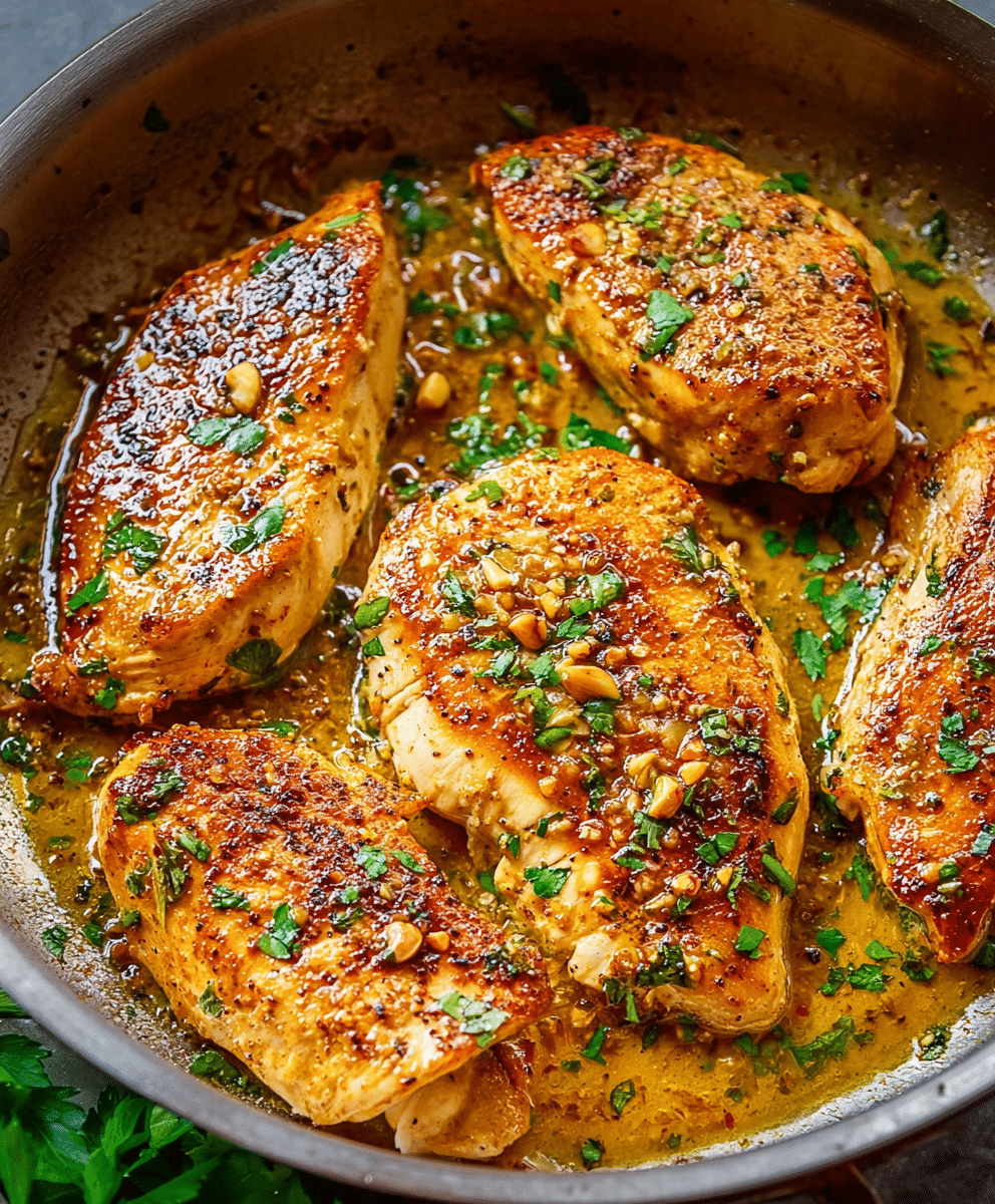 - Turn off the heat and return chicken to the skillet, spooning garlic butter sauce over the chicken. Garnish with parsley and serve immediately.