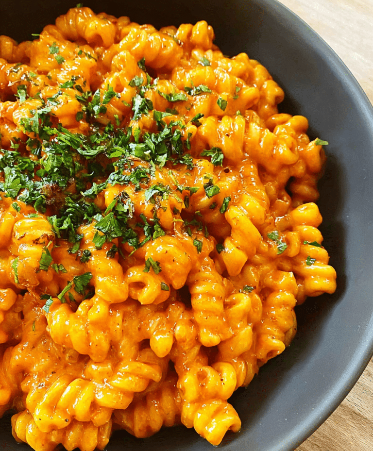 The pasta is creamy, spicy, and slightly sweet, with the umami depth of gochujang. Garlic and Parmesan balance the heat, while butter and cream add richness. Optional proteins and vegetables add heartiness and texture.