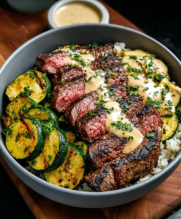 Beyond convenience, this steak bowl stands out because of the depth of flavors: smoky grilled zucchini, tender steak, and a tangy, creamy sauce come together in a visually appealing, nutrient-packed meal. It’s a versatile dish that works for casual dinners, meal prep, or even light entertaining.