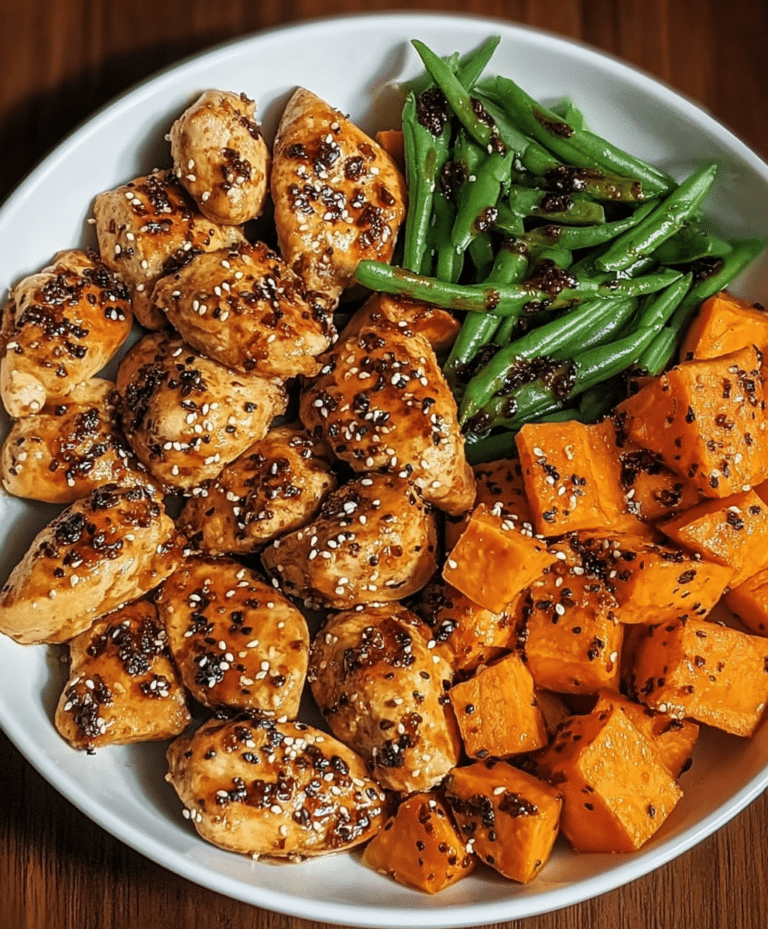 The texture contrast is just as satisfying—juicy chicken, soft roasted sweet potatoes, and crisp-tender green beans all coated in a glossy sauce that ties everything together.