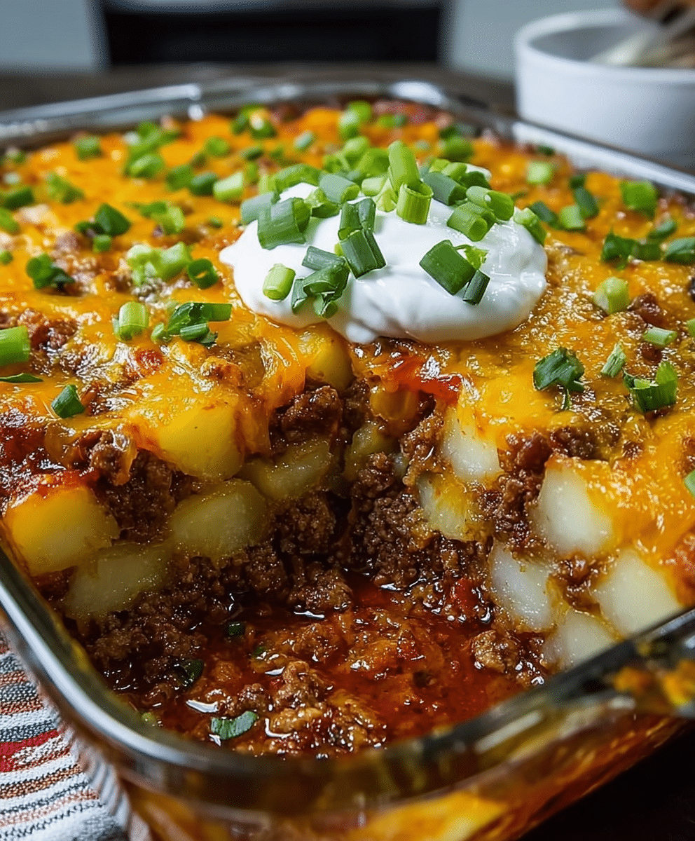 There’s something magical about a hearty casserole that feels like a warm hug on a cold evening. Loaded Potato & Meatloaf Casserole takes the nostalgic comfort of classic meatloaf and creamy mashed potatoes, then layers them into one bubbling, cheesy, family-friendly dish. Every bite brings the savory richness of seasoned ground beef, the fluffiness of buttery mashed potatoes, and the gooey goodness of melted cheddar — finished with a sprinkle of green onions for that perfect fresh bite.