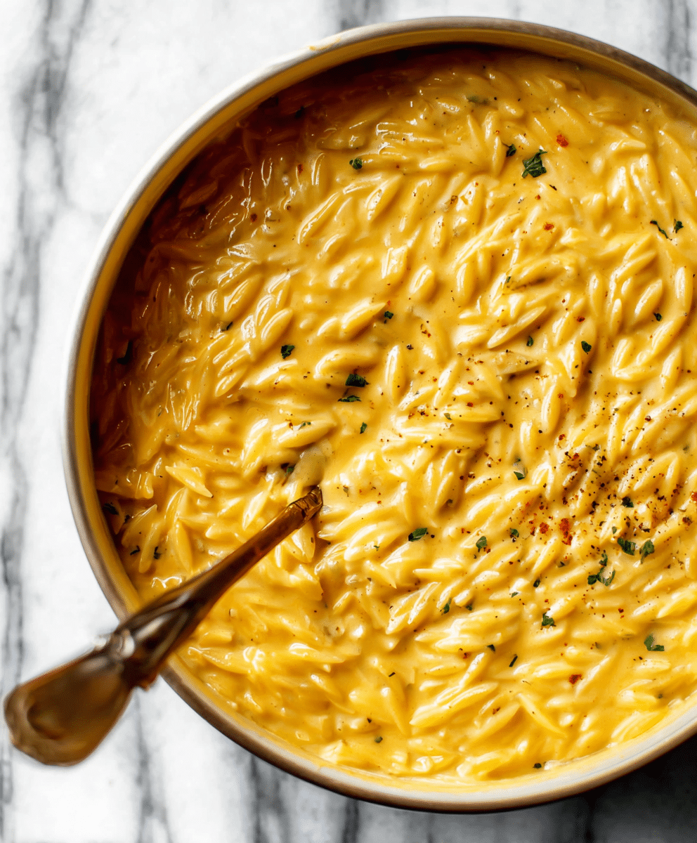 This recipe, originally shared by Natasha Bull, captures the essence of everyday comfort food: simple ingredients, big flavor, and almost no cleanup. Orzo is gently toasted with garlic and onions, simmered in a creamy broth until tender, and finished with generous handfuls of cheddar and Parmesan cheese. The result is a glossy, creamy pot of cheesy goodness that pairs perfectly with nearly any main dish — or stands proudly on its own.