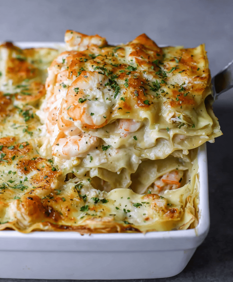 This Seafood Lasagna with Shrimp and Crab is a rich, creamy, and indulgent comfort dish made with layers of tender pasta, seafood, ricotta filling, and a velvety white sauce, all baked until golden and bubbly.