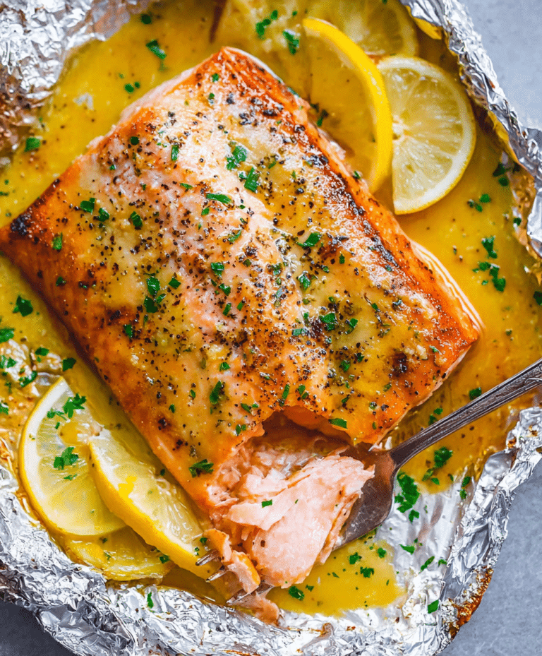 If you love buttery, garlicky, and slightly tangy salmon, this Sheet Pan Lemon Garlic Butter Salmon recipe is a game-changer. By baking the salmon in a foil packet with lemon slices and a rich garlic-butter mixture, the fish stays tender and perfectly moist. A brief broil at the end gives it a beautiful golden finish.