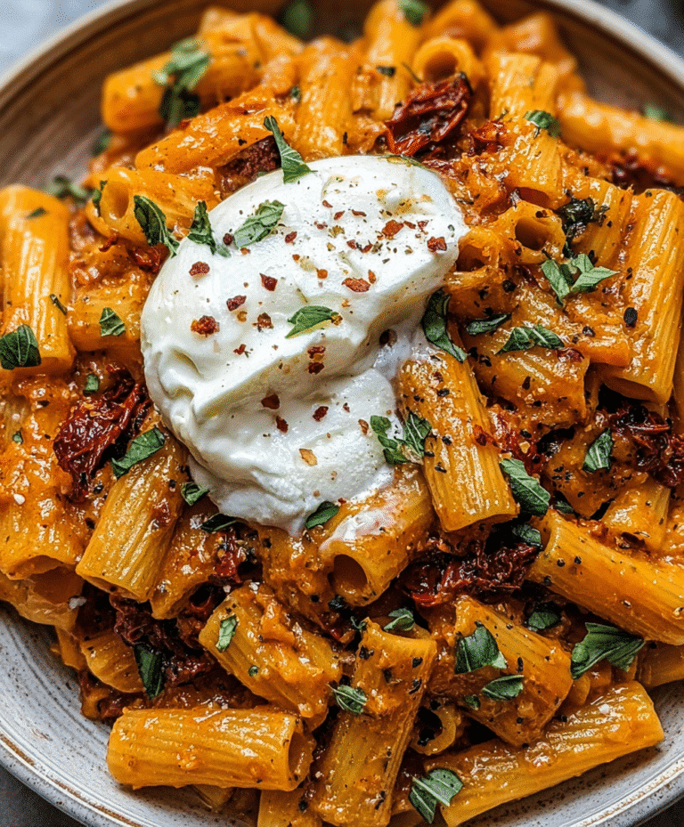 The combination of roasted red peppers, sweet sun-dried tomatoes, fragrant herbs, and creamy burrata is nothing short of magical. Each bite offers a silky, rich texture and a depth of flavor that will make this pasta your new go-to comfort food.