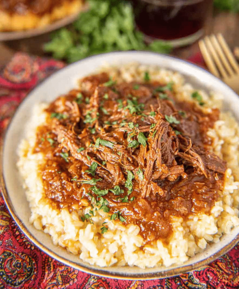 - Return roast to the pot, cover, and bake at 325°F (165°C) for 2½–3 hours until fork-tender. Shred and keep warm.