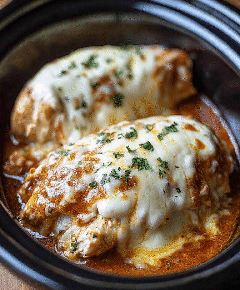 Tender chicken breasts smothered in marinara and melty mozzarella, all made effortlessly in your slow cooker!