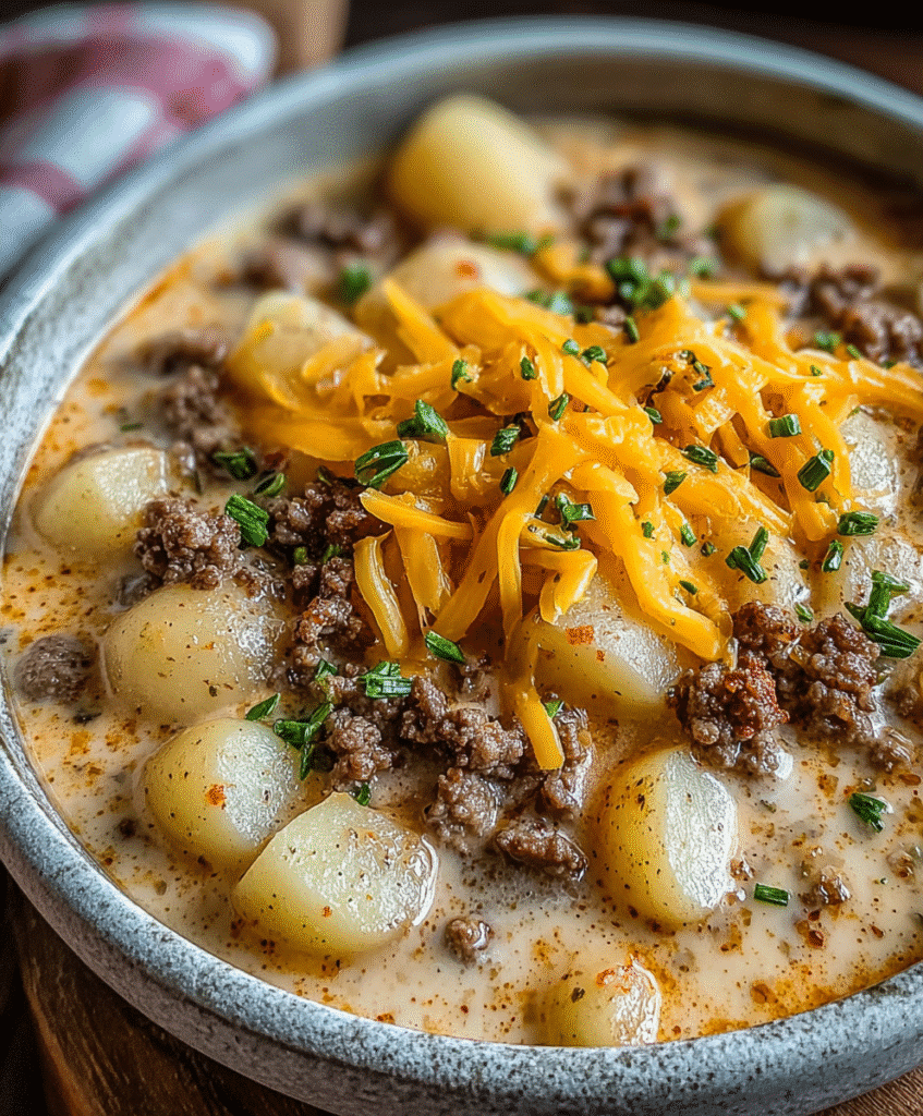 A comforting and creamy soup loaded with ground beef, potatoes, and cheddar cheese, perfect for chilly days.