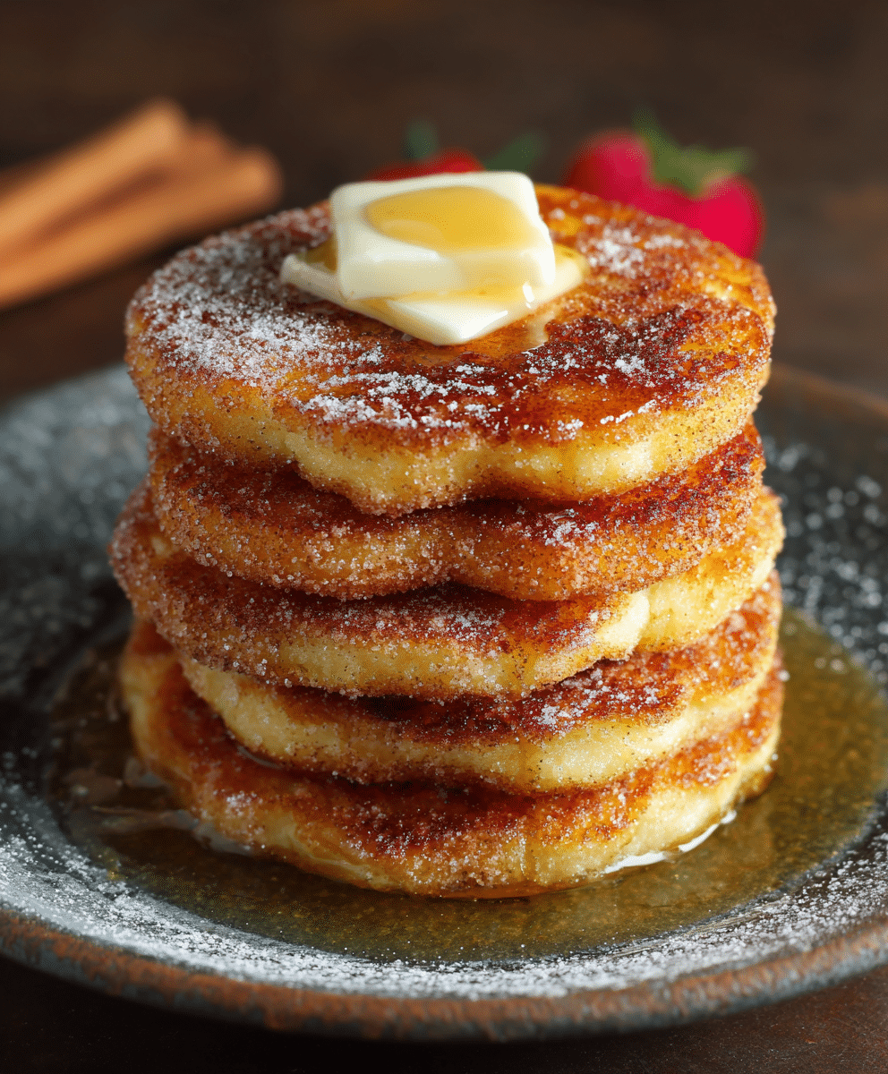 Serve Spanish Churro-Inspired Pancakes stacked on a warm plate and generously dusted with cinnamon sugar. They look especially inviting when served fresh off the skillet, with their golden surfaces and aromatic topping. These pancakes work beautifully as the centerpiece of a relaxed breakfast or brunch spread.