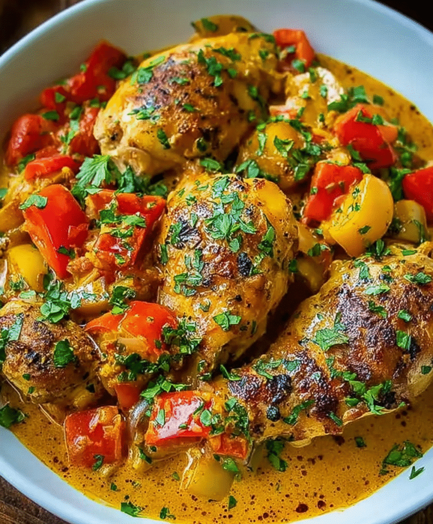 This dish is creamy, warmly spiced, slightly sweet from bell peppers, and balanced by the acidity of tomatoes and lime. The chicken becomes tender as it simmers, soaking up the vibrant flavors.