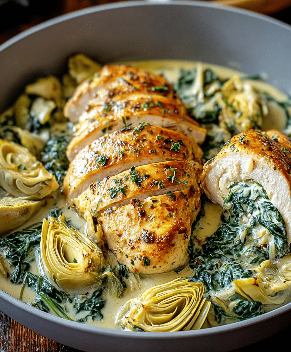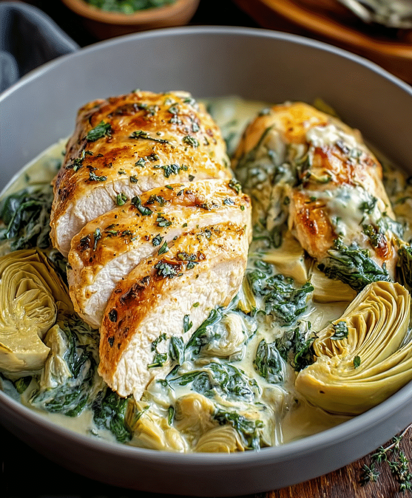 Inspired by the classic spinach artichoke dip, this recipe transforms those familiar flavors into a complete, savory main course built around juicy chicken breasts and a velvety cream sauce. It’s decadent without being heavy, rich without feeling overwhelming, and layered with enough freshness from the basil and spinach to keep each bite bright and balanced.