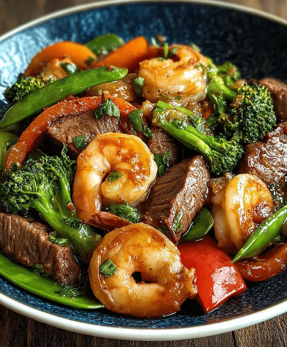A quick and flavorful stir fry featuring tender steak and juicy shrimp, packed with colorful vegetables and a savory sauce.