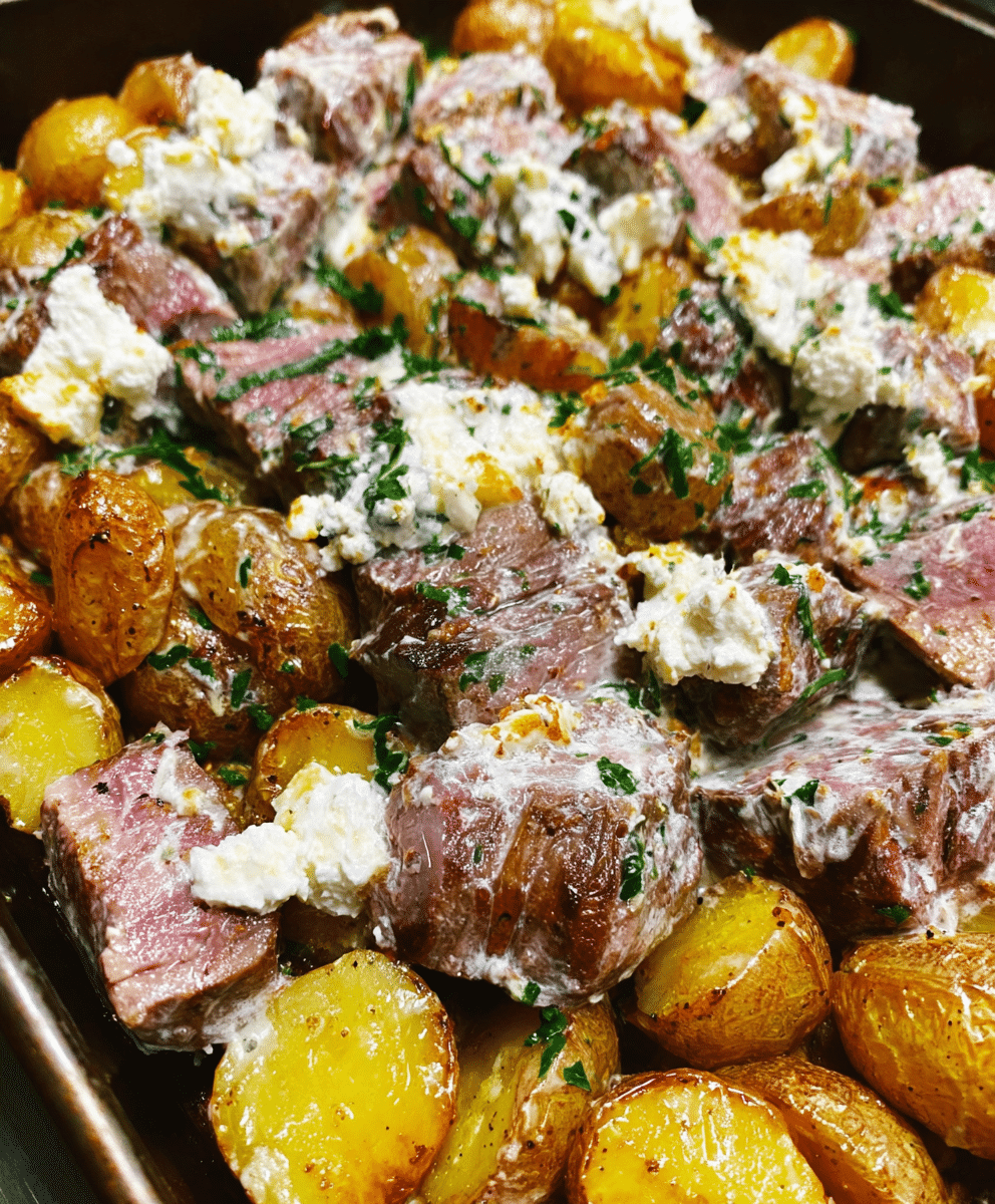 Steak, Potatoes, and Goat Cheese is the ultimate one-pan dinner: simple, flavorful, and satisfying. With minimal prep, a handful of ingredients, and a sheet pan, you get a meal that feels gourmet but is surprisingly easy. The tender steak, golden roasted potatoes, and creamy goat cheese make this a recipe that’s perfect for weeknights, family dinners, or casual gatherings.