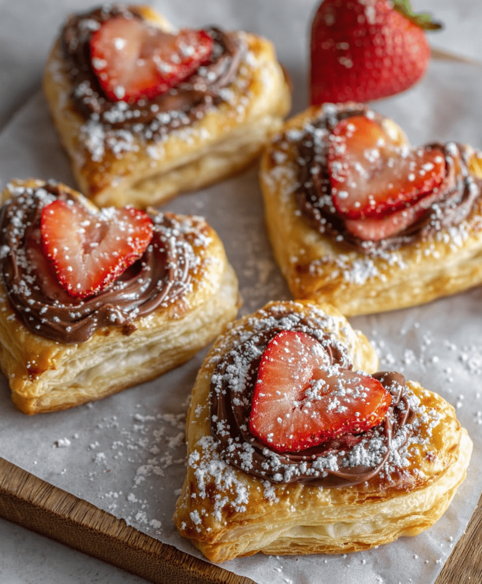 Flaky, golden puff pastry surrounds a rich layer of chocolate hazelnut spread and sweet, softened strawberries. Once baked, the pastry puffs dramatically, creating crisp, buttery layers that shatter delicately with each bite. A final dusting of powdered sugar gives these pastries their signature bakery-style finish, making them ideal for special occasions that call for something heartfelt but not overcomplicated.