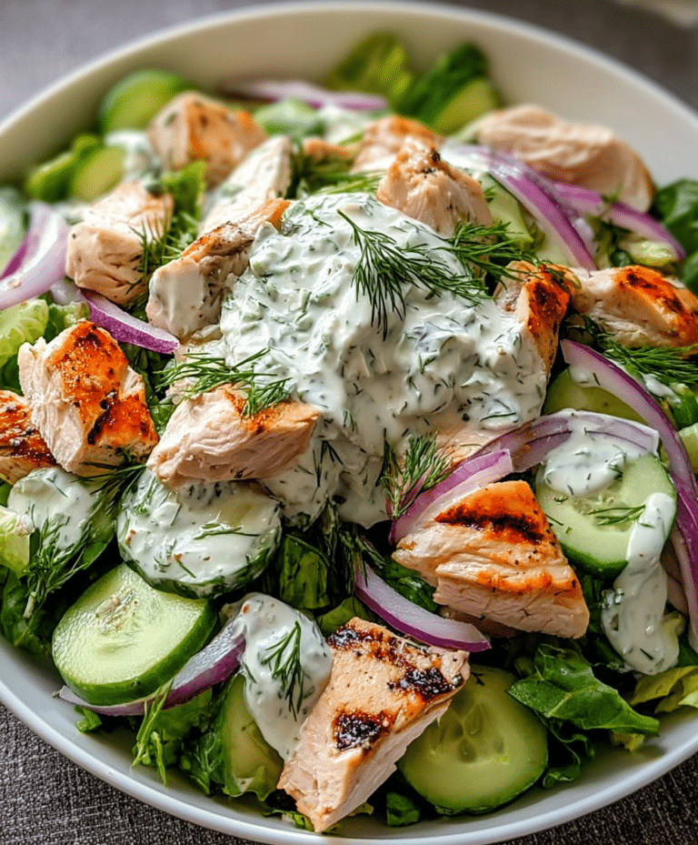 The salad delivers creamy, tangy, and herby notes from tzatziki combined with the mild richness of shredded chicken. Optional toppings like feta add saltiness, olives add briny depth, and avocado adds a buttery texture. The cucumber keeps the dish crisp and refreshing, making each bite balanced and light yet satisfying.
